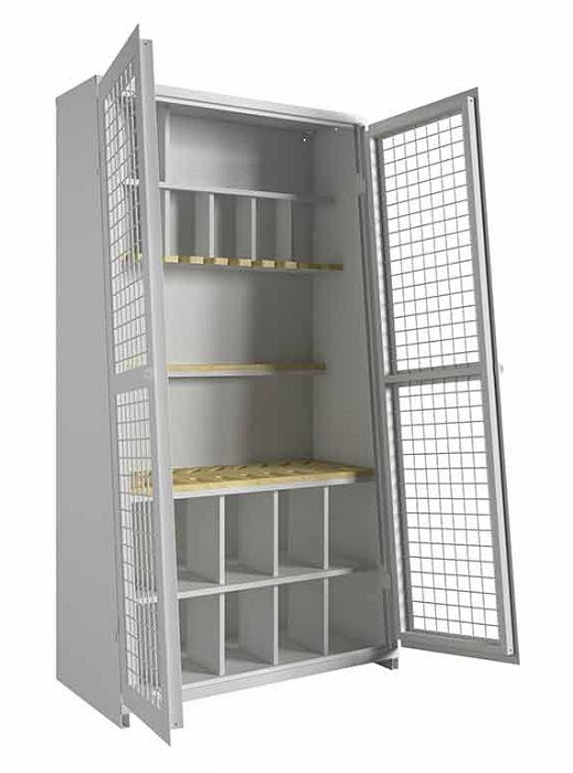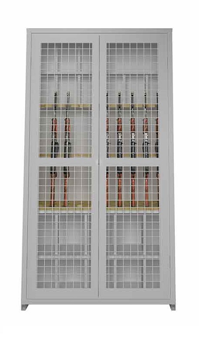 Армейский шкаф серии ШХО-103 пирамида предназначен для хранения различных модификаций автомата Калашникова. Шкаф полностью соответствует приказу Министерства обороны РФ №333. Изготовлен из высококачественной стали толщиной 1,5 мм. Двери выполнены из сварной решетки диаметром 5 мм, полки из фанеры толщиной 20 мм. Дополнительно предусмотрены места для хранения магазинов, штык-ножей, масленок, противогазов и саперных лопаток. Цвет шкафа: серый Ral 7024. Поставляется в сварном виде.