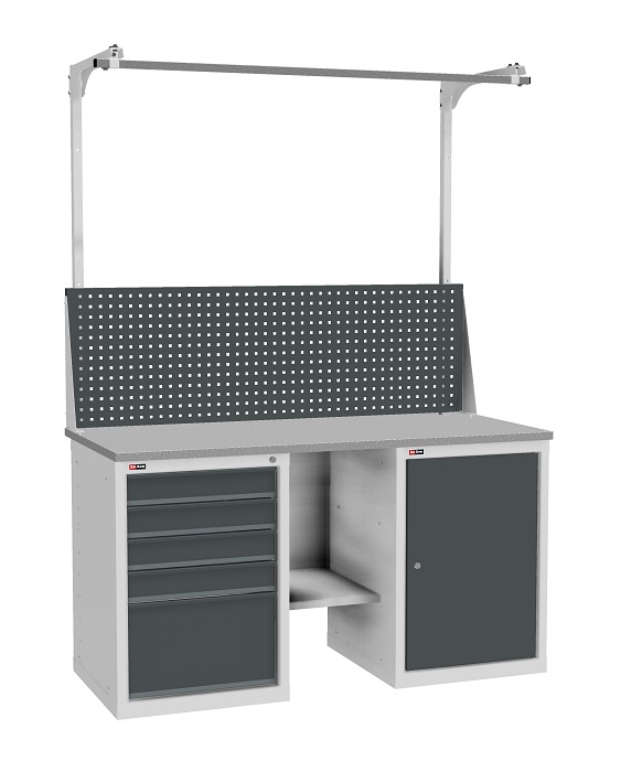 Цвет верстака: серый Ral 7038, лицевая панель ящиков/дверей антрацит Ral 7016. Тип покрытия: эпоксидная порошковая краска. Поставляется в разобранном виде