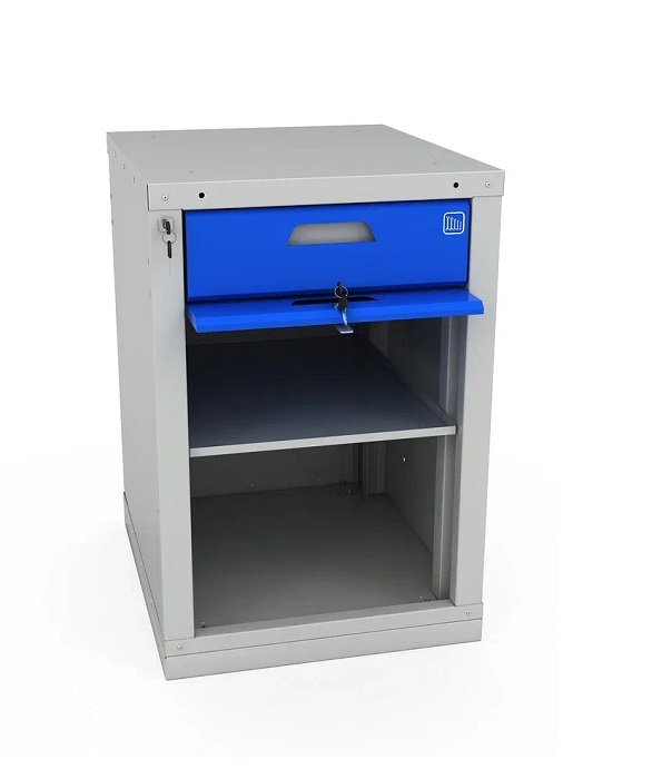 Тумба Woker 02-1 имеет одну регулируемую по высоте полку с шагом 50 мм. Полка тумбы установлена на стальные салазки, которые позволяют выдвигать полку на себя на 70% для облегчения разгрузки/погрузки. Ящик комплектуется противоскользящим ковриком и набором наклеек с пиктограммами для маркировки содержимого ящика. Полезный размер ящика: (ШхГ) 459х612 мм. Дверь тумбы закрывается на цилиндрический ключевой замок со стальной поворотной ручкой, секретность замка 2000 комбинаций. Открывание двери во внутрь тумбы (задвижная дверь). Цвет: корпус верстака - серый Ral 7035, лицевая панель тумбы Ral 5005