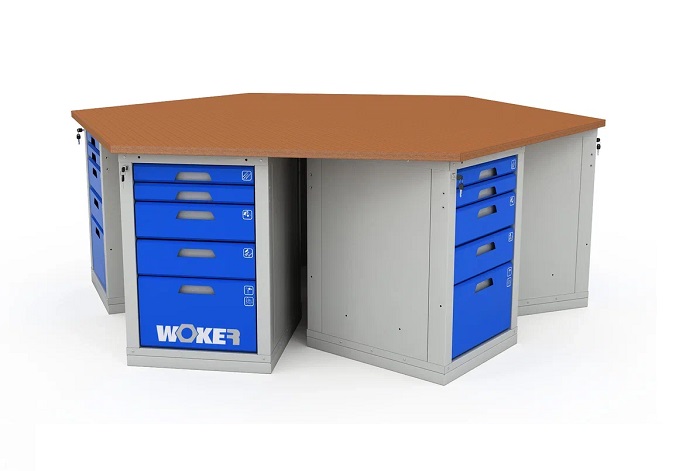 В комплектацию верстака входит: столешница Woker 2500, шесть тумб Woker 05. Столешница выполнена из шлифованной березовой многослойной фанеры толщиной 30 мм. Снаружи фанера обработана влагостойким антисептиком цвета "красное дерево", что придает фанере повышенную влагостойкость и более темный цвет. Тумба Woker 05 комплектуется 5 выдвижными ящиками (2 высотой - 135 мм, 2 высотой - 65 и 1 высотой - 275 мм). Полезный размер ящика: (ШхГ) 459х612 мм. В ящиках есть противоскользящие коврики и набор наклеек с пиктограммами для маркировки содержимого.
