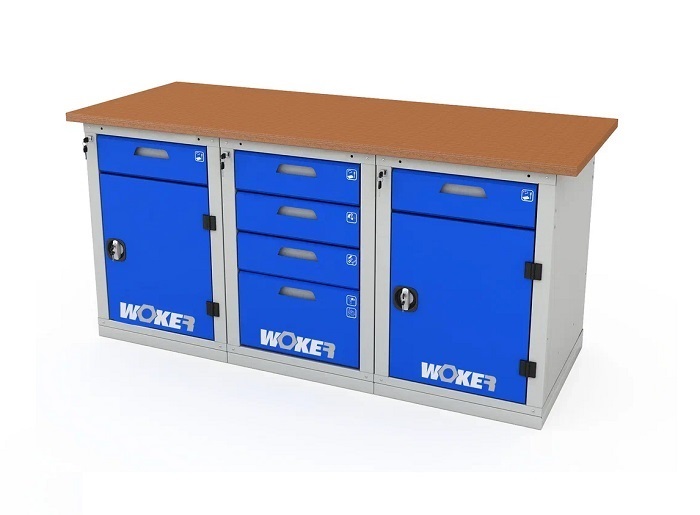 В комплектацию верстака входит: столешница Woker 1800, две тумбы Woker 02, одна тумба Woker 04. Столешница выполнена из шлифованной березовой многослойной фанеры толщиной 30 мм. Снаружи фанера обработана влагостойким антисептиком цвета "красное дерево", что придает фанере повышенную влагостойкость и более темный цвет. Тумба Woker 02 имеет одну регулируемую по высоте полку (шаг 50 мм). Полка тумбы установлены на стальные салазки, которые позволяют выдвигать полку на себя на 70% для облегчения разгрузки/погрузки. Дверь тумбы закрывается на цилиндрический замок со стальной поворотной ручкой, секретность замка 2000 комбинаций. Открывание двери на 180 градусов. Тумба Woker 04 комплектуется 4 выдвижными ящиками (3 высотой - 135 мм, 1 высотой - 275 мм). Полезный размер ящика: (ШхГ) 459х612 мм. В ящиках есть противоскользящие коврики и набор наклеек с пиктограммами для маркировки содержимого.