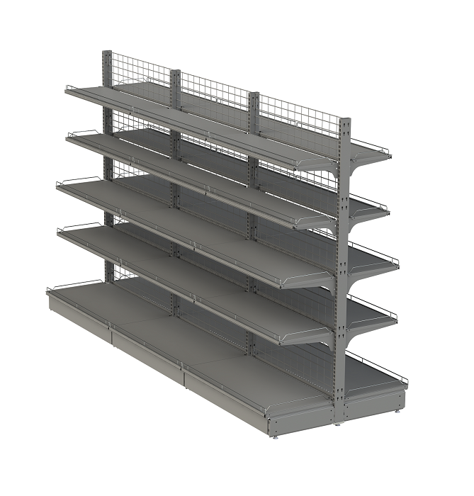Островной стеллаж с сетчатой стенкой предназначен для продажи продовольственных и непродовольственных товаров. Относится к основным стеллажам, которые используются в супермаркетах и магазинах самообслуживания.
